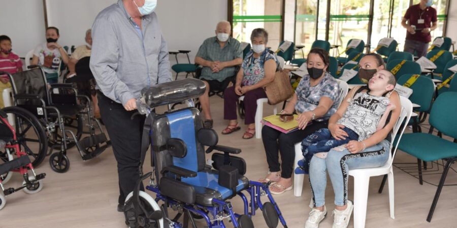 Tratando de conservar los protocolos de bioseguridad y evitar el desplazamiento del total de personas beneficiadas, el primer mandatario de los risaraldenses, acompañado de la Secretaria de Desarrollo Social, Elizabeth Diosa entregó en el auditorio Gonzalo Vallejo 5 de estas ayudas en representación de las 143 totales, entre ellas está: 86 sillas de ruedas con braceros y pieseros removibles, 6 sillas pediátricas activas, 4 sillas pediátricas neurológicas, 20 caminadores, 20 bastones y 7 pares de muletas.
