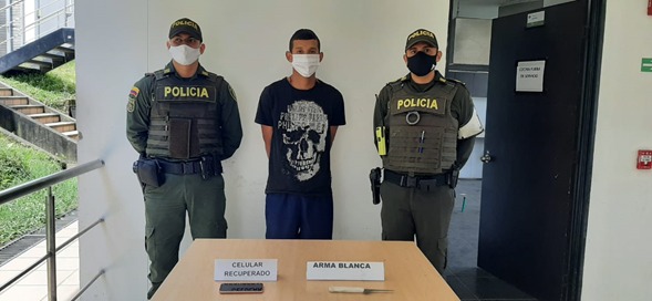 De acuerdo con la investigación, este 20 de agosto, la víctima se transportaba en un bus de servicio público a la altura del barrio Las Brisas la ciudad de Pereira, en el que se presume que el hombre le arrebató el móvil y emprendió la huida, ocultándose en una vivienda del sector. Enseguida, en el interior del inmueble, se logró la captura de Castañeda Ramírez, a quien le hallaron el aparato celular y el arma blanca.
