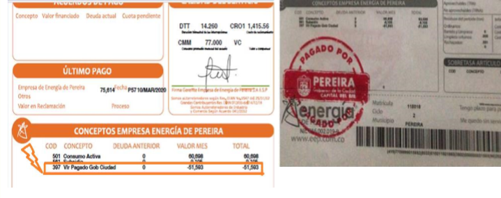 En atención al convenio No. CO1.PCCNTR.1495069 suscrito entre la Empresa de Energía de Pereira y la Alcaldía de Pereira y conforme con lo manifestado por el alcalde Carlos Maya el pasado 29 de marzo con el Plan 3,2,1,0, los estratos residenciales 1,2 y 3 del servicio de energía eléctrica ubicados en la ciudad de Pereira, verán reflejado en su factura de energía a partir de este mes el concepto denominado “Valor Pagado Gobierno de la Ciudad”.