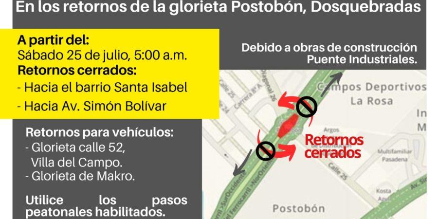 “Por el cierre de las vías aledañas a la glorieta de Postobón, que se cumplirá este sábado desde las primeras horas de la mañana, se hace necesario que los conductores no utilicen el retorno norte y sur; es decir, que no den la vuelta por el citado paso, debido a que la firma ejecutora de las obras ocupará el espacio señalado para el montaje de las vigas de la super estructura que llevará el puente”, explicó la secretaria de Tránsito y Movilidad de Dosquebradas, Ángela Jazmín Hidalgo.