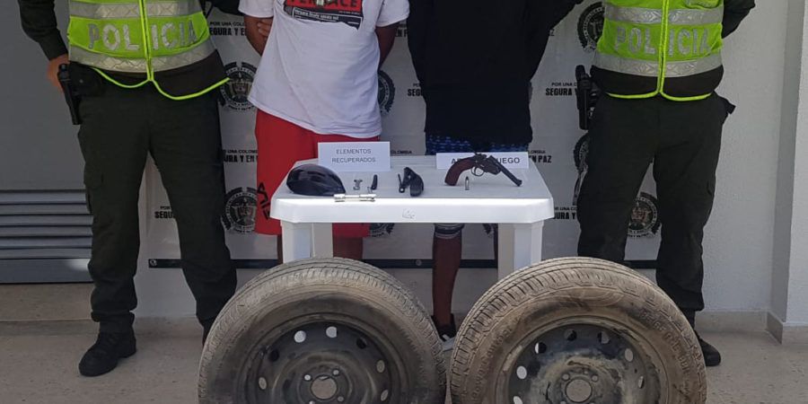 Siendo interceptados en la calle 4 del barrio San Judas, donde colisionan contra un barranco, hallándoles al interior del mismo, una plumilla, dos antenas, dos llantas con rines y la incautación de un arma de fuego, fabricación artesanal con un cartucho calibre 38 mm, un vehículo color blanco, herramientas, prendas de vestir y gorras utilizadas para cometer el delito, varias llantas de automotor.