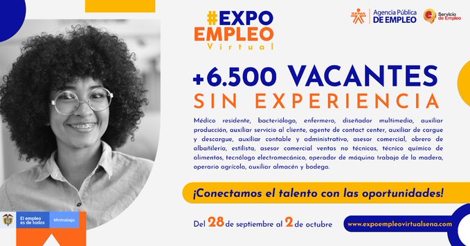 Cabe destacar que en ExpoEmpleo, que culmina este viernes 2 de octubre y que se desarrolla por la página expoempleovirtualsena.com, del número total de vacantes 6.500 de ellas no requieren experiencia laboral, lo cual facilita la intermediación laboral y la llegada de talento humano que reclama una primera oportunidad.