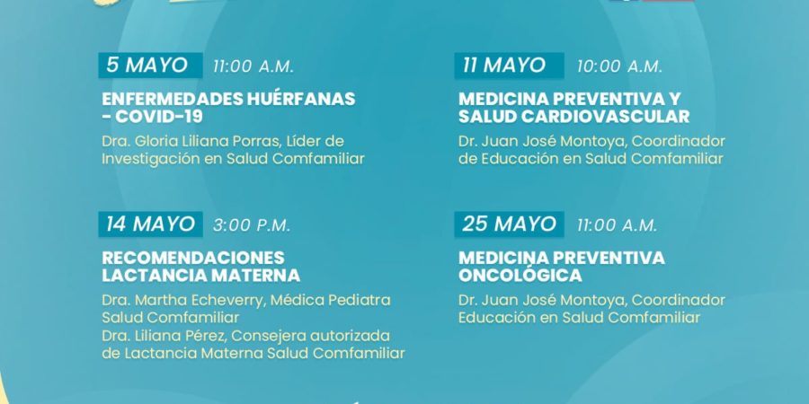 No te pierdas la primera charla del mes, mañana martes 5 de mayo a las 11:00 a.m liderada por la Médica Genetista Gloria Liliana Porras Hurtado, quien nos hablará sobre las Enfermedades Huérfanas y el Covid.19 🦠