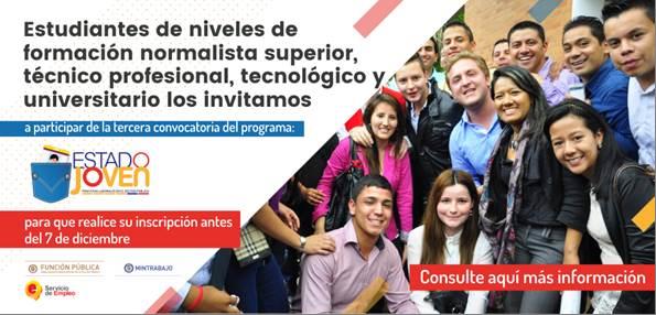 Los estudiantes interesados en hacer sus prácticas laborales en el sector público podrán inscribirse hasta el 7 de diciembre al Programa Estado Joven, impulsado por el Ministerio de Trabajo y Función Pública con el propósito de facilitar los procesos de transición del ciclo de aprendizaje al mercado laboral de los jóvenes, a través de incentivos como auxilio de un salario mínimo mensual, y aseguramiento en los subsistemas de seguridad social en salud, pensiones y riesgos laborales.