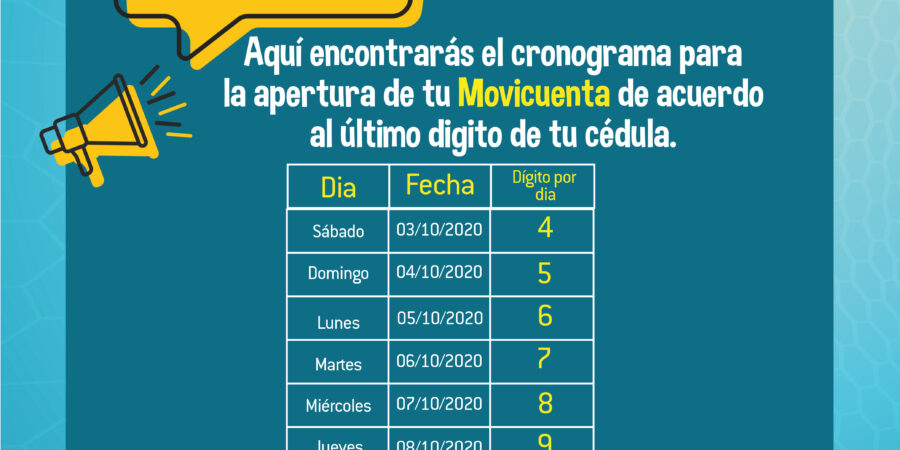 El programa Jóvenes en Acción informa que a partir del 03 hasta el 18 de octubre del 2020 los jóvenes mayores de edad podrán realizar la apertura de su Movicuenta según el último dígito de su documento.