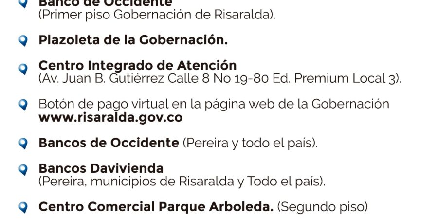 | Los propietarios que deseen pagar el Impuesto Vehicular vigencia 2021, podrán realizarlo en 9 puntos de liquidación y pago que se tienen autorizados por la Secretaría de Hacienda del departamento tanto en Pereira, como en los demás municipios del departamento. “Con esta cantidad de puntos de pago no solo estamos buscando facilitarles a los contribuyentes el pago de esta responsabilidad, sino además, brindarle otras alternativas a los propietarios para que no tengan que someterse a largas filas”, expresó Mejía Bermúdez. De acuerdo con el representante de la cartera de Hacienda, los puntos que ya se tienen habilitados y a disposición de los contribuyentes son los siguientes: Banco de Occidente (Primer piso de la Gobernación de Risaralda).Centro Integrado de Atención (Avenida Juan B. Gutiérrez Calle 8 No 19-80 Edificio Premium Local 3)Botón de pago virtual en la página web de la Gobernación www.risaralda.gov.coBancos de Occidente (Pereira y todo el país)Bancos Davivienda (Pereira – Municipios de Risaralda y Todo el país)Plazoleta de la Gobernación (A partir del 30 de junio)Centro Comercial Arboleda (Segundo piso)Centro Comercial Pereira Plaza (Segundo piso)Centro de Atención Oportuno en el Edificio Torre Central (A partir del 21 de junio) Para mayor información en la página web de la Gobernación de Risaralda www.risaralda.gov.co o en los siguientes números de celular: 3182063001 – 3176670326 – 3164819508. #Ejealdía #Risaralda |