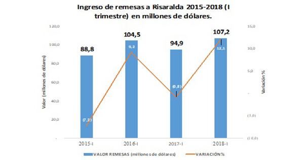 Al corte del primer trimestre del año Risaralda fue el cuarto departamento con mayor cantidad de remesas recibidas, después de Valle del Cauca, Cundinamarca y Antioquia, con un total de US$107,2 millones, que representan un crecimiento de 12,1 % respecto al mismo periodo del año 2017, cuando el departamento recibió un total de US$94,9 millones en remesas.