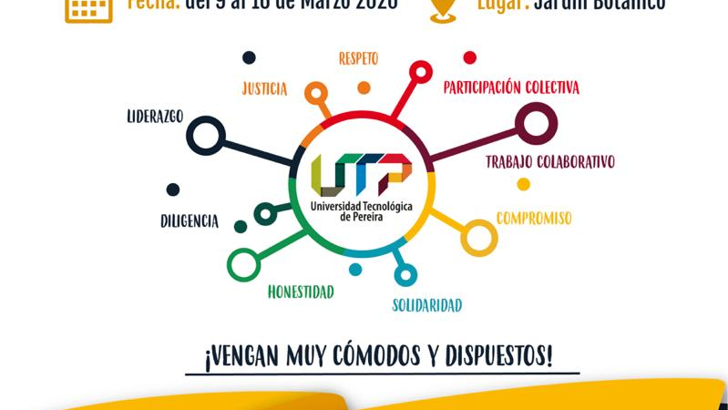 La Vicerrectoría Administrativa y Financiera y Gestión del Talento Humano, invitan a participar durante la semana del 9 al 16 de marzo de 2020 de un encuentro, donde vivenciaremos un espacio universitario, integrando personas, ideas y destrezas pedagógicas con una orientación basada en los valores. Una experiencia de participación colectiva y práctica, trabajo colaborativo, y una oportunidad para posibilitar una mejor calidad de vida de nuestra UTP.